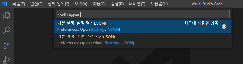 설치가 완료되면 F1을 눌러 명령어 팔렛트를 열어 settings.json을 입력하여
