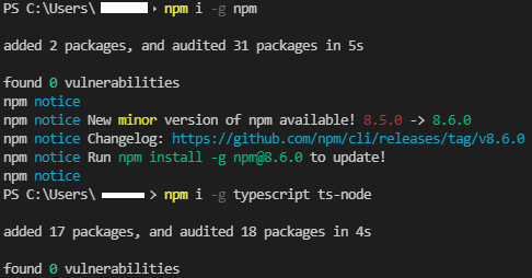 터미널에 npm을 업데이트 후 타입스크립트 컴파일러를 설치합니다.