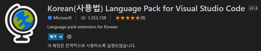 위의 확장에서 Korean(사용법) Language Pack for Visual Studio Code 을 검색하여 한국어팩을 설치합니다.