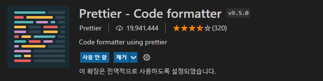 확장 메뉴에서 Prettier - Code formatter 를 검색하여 설치합니다.