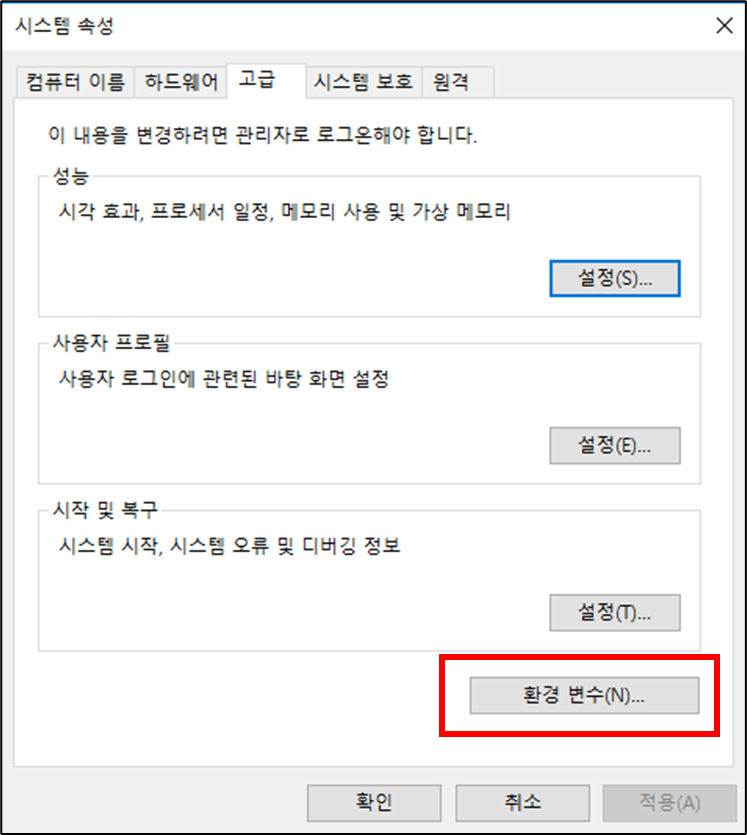 작업표시줄 검색창에 [시스템 환경 변수 편집]을 입력하여 시스템 속성 창을 엽니다.